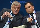 III Международный форум и выставка "Интеллектуальные транспортные системы России" в отеле Holiday Inn Moscow Sokolniki. Старший советник генерального директора ОАО "РЖД" Валентин Гапанович (слева) и член комитета Государственной думы России по транспорту и строительству Сергей Тен (справа) на форуме.