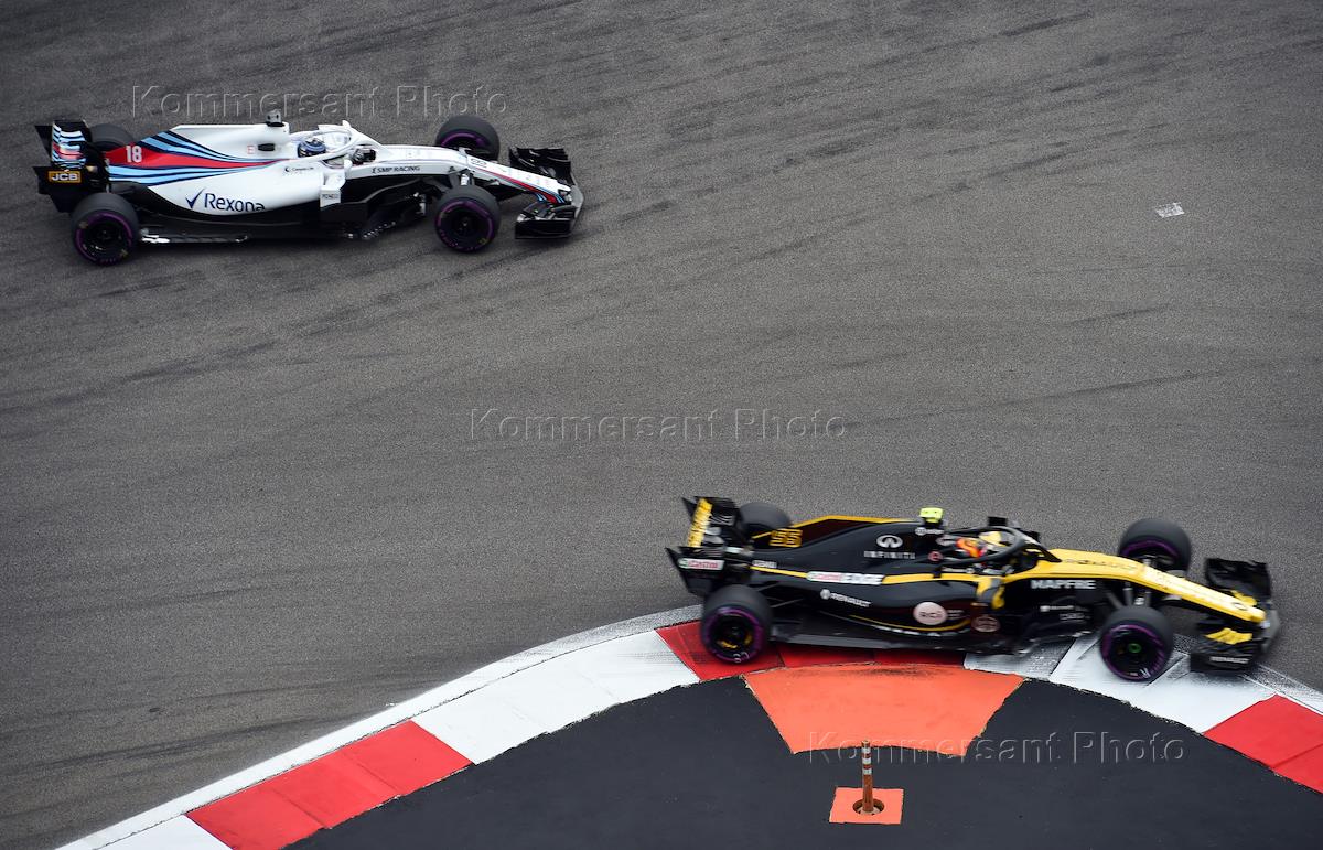 Пятый этап Чемпионата мира по кольцевым автогонкам Формула 1 ВТБ Гран-При России 2018. Гонщик команды Williams Лэнс Стролл (слева) и гонщик команды Renault Sport F1 Team Карлос Сайнс (справа) во время заезда.