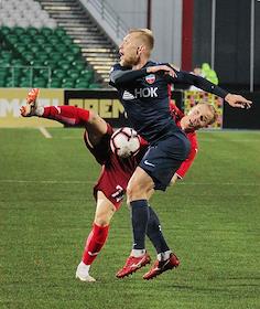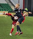 оссийская Премьер-лига (РПЛ). Чемпионат России по футболу 2018/2019. 9-й тур. Матч между командами ФК "Уфа" (Уфа) и ФК "Енисей" (Красноярск) на стадионе "Нефтяник". Игрок команды "Енисей" Валерий Кичин (слева) и игрок команды "Уфа" Дмитрий Сысуев (справа) во время матча.