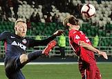 Российская Премьер-лига (РПЛ). Чемпионат России по футболу 2018/2019. 9-й тур. Матч между командами ФК "Уфа" (Уфа) и ФК "Енисей" (Красноярск) на стадионе "Нефтяник". Игрок команды "Енисей" Валерий Кичин (слева) и игрок команды "Уфа" Дмитрий Сысуев (справа) во время матча.