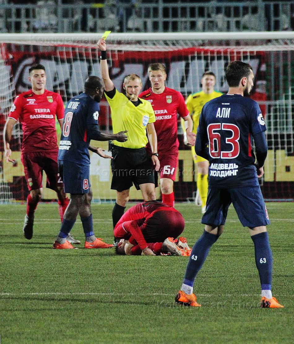 Российская Премьер-лига (РПЛ). Чемпионат России по футболу 2018/2019. 9-й тур. Матч между командами ФК "Уфа" (Уфа) и ФК "Енисей" (Красноярск) на стадионе "Нефтяник". Главный судья матча Сергей Иванов (в центре) во время матча.