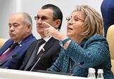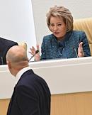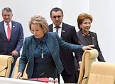 Пленарное заседание Совета Федерации (СФ) России. Справа налево: председатель СФ России Валентина Матвиенко, первый заместитель председателя СФ России Николай Федоров и заместитель председателя СФ России Ильяс Умаханов во время заседания.