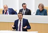 Пленарное заседание Совета Федерации (СФ) России. Министр экономического развития России Максим Орешкин (в центре) во время выступления на заседании.