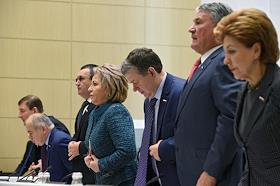 Пленарное заседание Совета Федерации (СФ) России. Справа налево: заместители председателя СФ России Галина Карелова, первый заместитель председателя СФ России Николай Федоров, председатель СФ России Валентина Матвиенко и заместитель председателя СФ России Юрий Воробьев во время заседания.