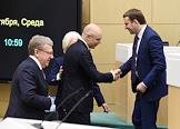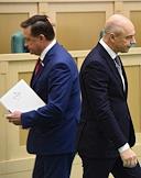 Пленарное заседание Совета Федерации (СФ) России. Представитель в СФ России от законодательного (представительного) органа государственной власти Ульяновской области Сергей Рябухин (слева) и первый заместитель председателя правительства России - министр финансов Антон Силуанов (справа) во время заседания.