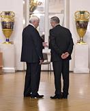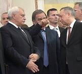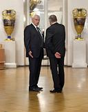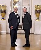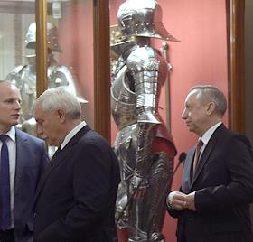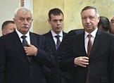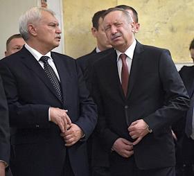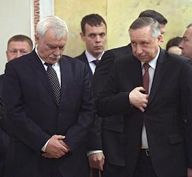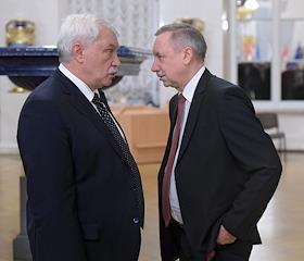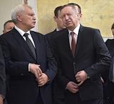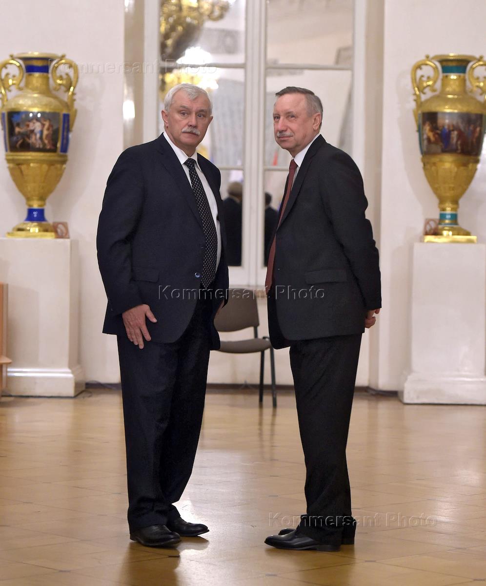 Рабочая поездка президента России Владимира Путина в Санкт-Петербург. Церемония открытия художественной выставки "Имперские столицы: Санкт-Петербург – Вена. Шедевры музейных коллекций" в Государственном Эрмитаже. Председатель совета директоров Объединенной судостроительной корпорации Георгий Полтавченко (слева) и временно исполняющий обязанности губернатора Санкт-Петербурга Александр Беглов (справа) во время церемонии.