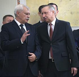 Рабочая поездка президента России Владимира Путина в Санкт-Петербург. Встреча президента России Владимира Путина и федерального канцлера Австрии Себастьяна Курца в Государственном Эрмитаже. Председатель совета директоров Объединенной судостроительной компании Георгий Полтавченко (слева) и временно исполняющий обязанности губернотора Санкт-Петербурга Александр Беглов (справа) во время встречи.