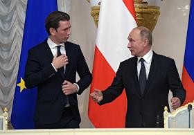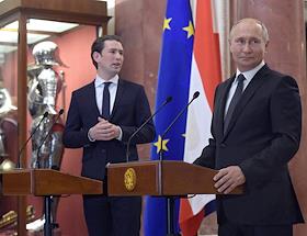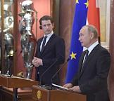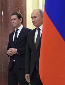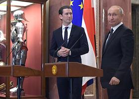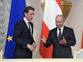 Рабочая поездка президента России Владимира Путина в Санкт-Петербург. Президент России Владимир Путин (справа) и федеральный канцлер Австрии Себастьян Курц (слева) во время совместной пресс-конференции по итогам встречи в Государственном Эрмитаже.