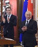 Рабочая поездка президента России Владимира Путина в Санкт-Петербург. Церемония открытия художественной выставки "Имперские столицы: Санкт-Петербург – Вена. Шедевры музейных коллекций" в Государственном Эрмитаже. Президент России Владимир Путин (справа) и федеральный канцлер Австрии Себастьян Курц (слева) во время церемонии.