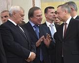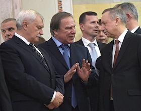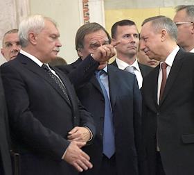 Рабочая поездка президента России Владимира Путина в Санкт-Петербург. Церемония открытия художественной выставки "Имперские столицы: Санкт-Петербург – Вена. Шедевры музейных коллекций" в Государственном Эрмитаже. Слева направо: Председатель совета директоров Объединенной судостроительной корпорации Георгий Полтавченко, художественный руководитель Санкт-Петербургского дома музыки Сергей Ролдугин и временно исполняющий обязанности губернатора Санкт-Петербурга Александр Беглов во время церемонии.