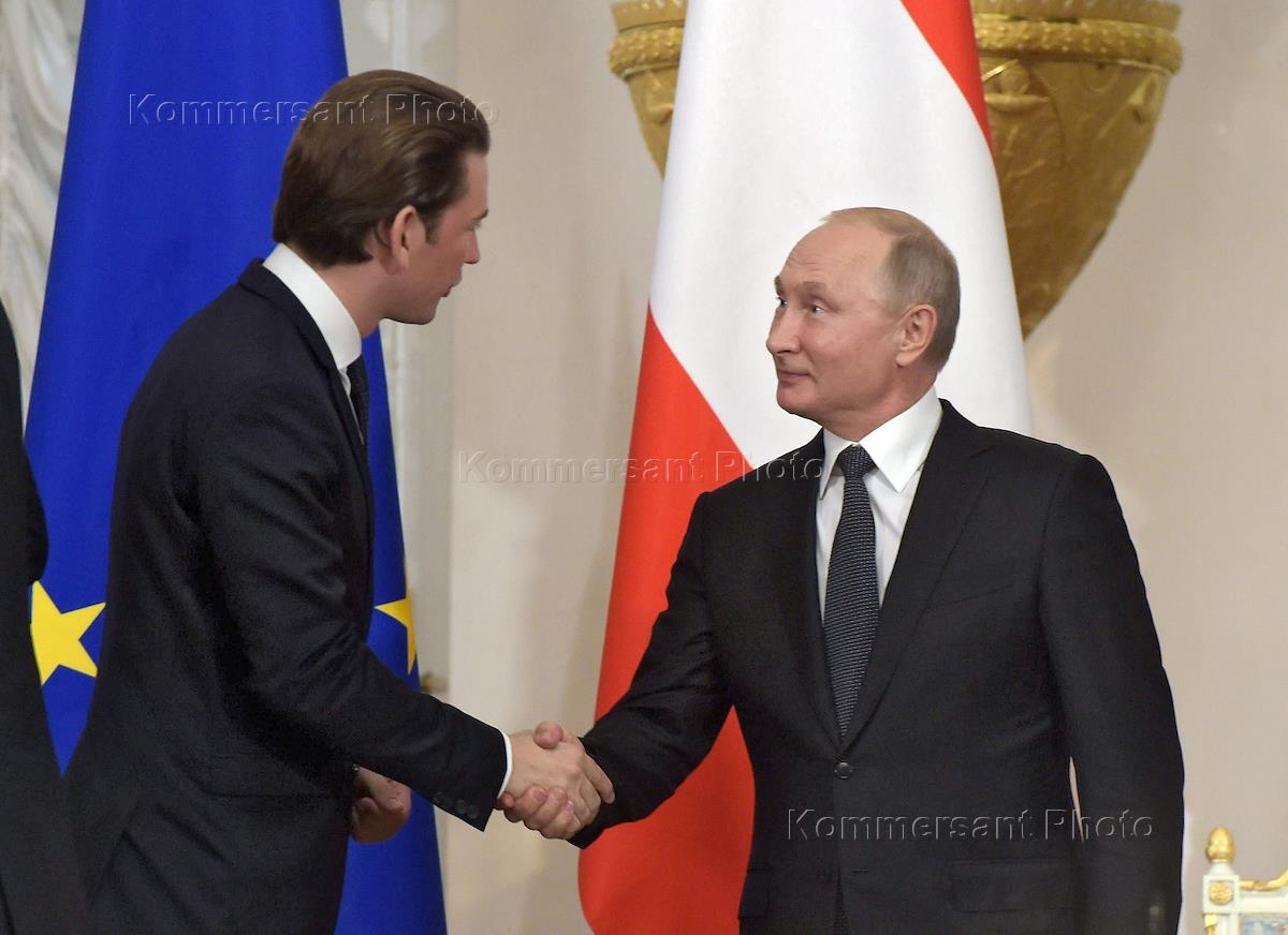Рабочая поездка президента России Владимира Путина в Санкт-Петербург. Президент России Владимир Путин (справа) и федеральный канцлер Австрии Себастьян Курц (слева) во время встречи в Государственном Эрмитаже.
