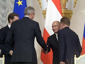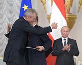 Рабочая поездка президента России Владимира Путина в Санкт-Петербург. Встреча президента России Владимира Путина и федерального канцлера Австрии Себастьяна Курца в Государственном Эрмитаже. Слева направо: Федеральный канцлер Австрии Себастьян Курц, председатель правления компании OMV Раинер Зееле, президент России Владимир Путин и председатель правления ПАО "Газпром" Алексей Миллер во время церемонии подписания совместных документов.