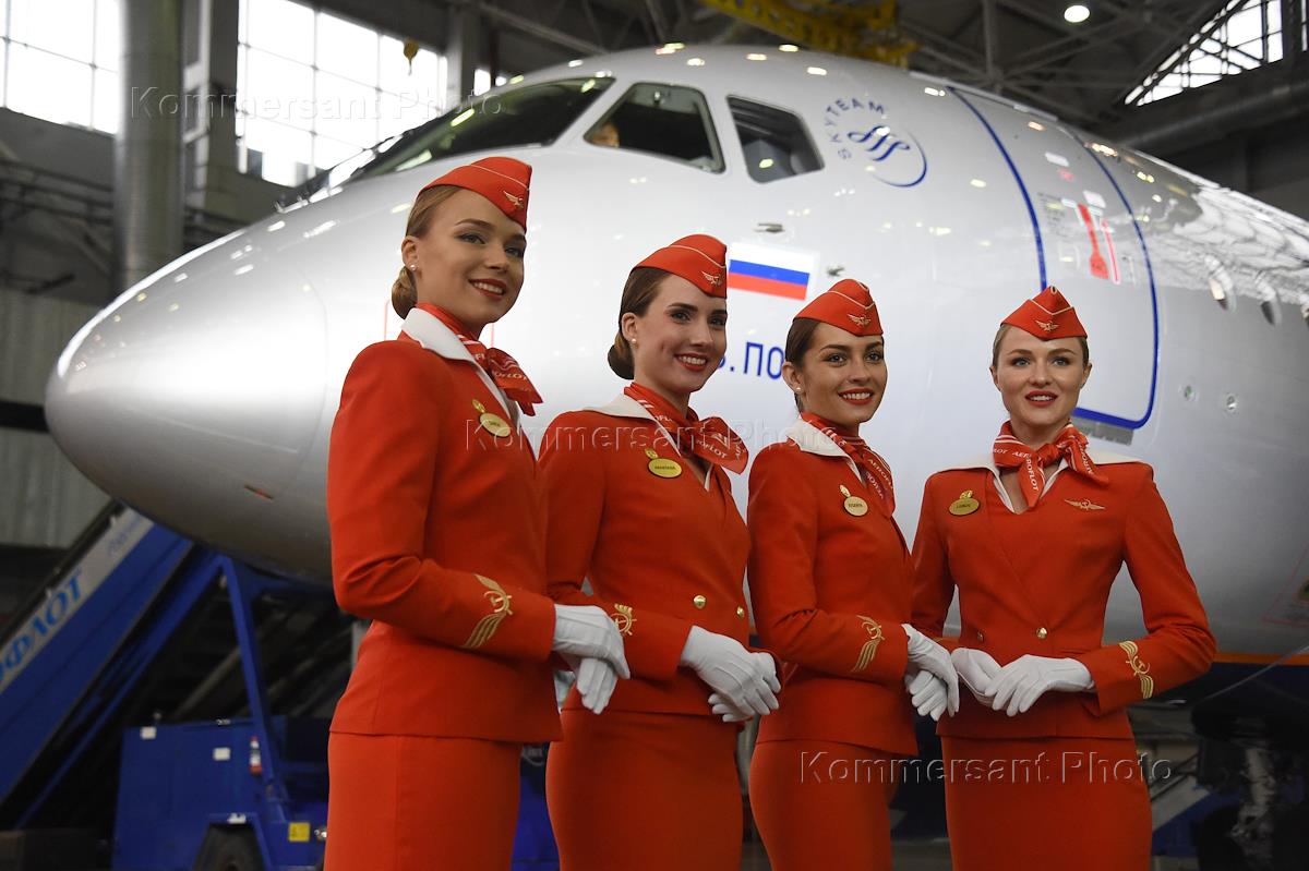 Мероприятие по случаю ввода в эксплуатацию юбилейного 50-го самолета Sukhoi Superjet 100 (SSJ100) и церемония передачи самолета авиакомпании "Аэрофлот" прошли в аэропорту "Шереметьево". Стюардессы авиакомпании "Аэрофлот" в салоне самолета Sukhoi Superjet 100 (SSJ100).