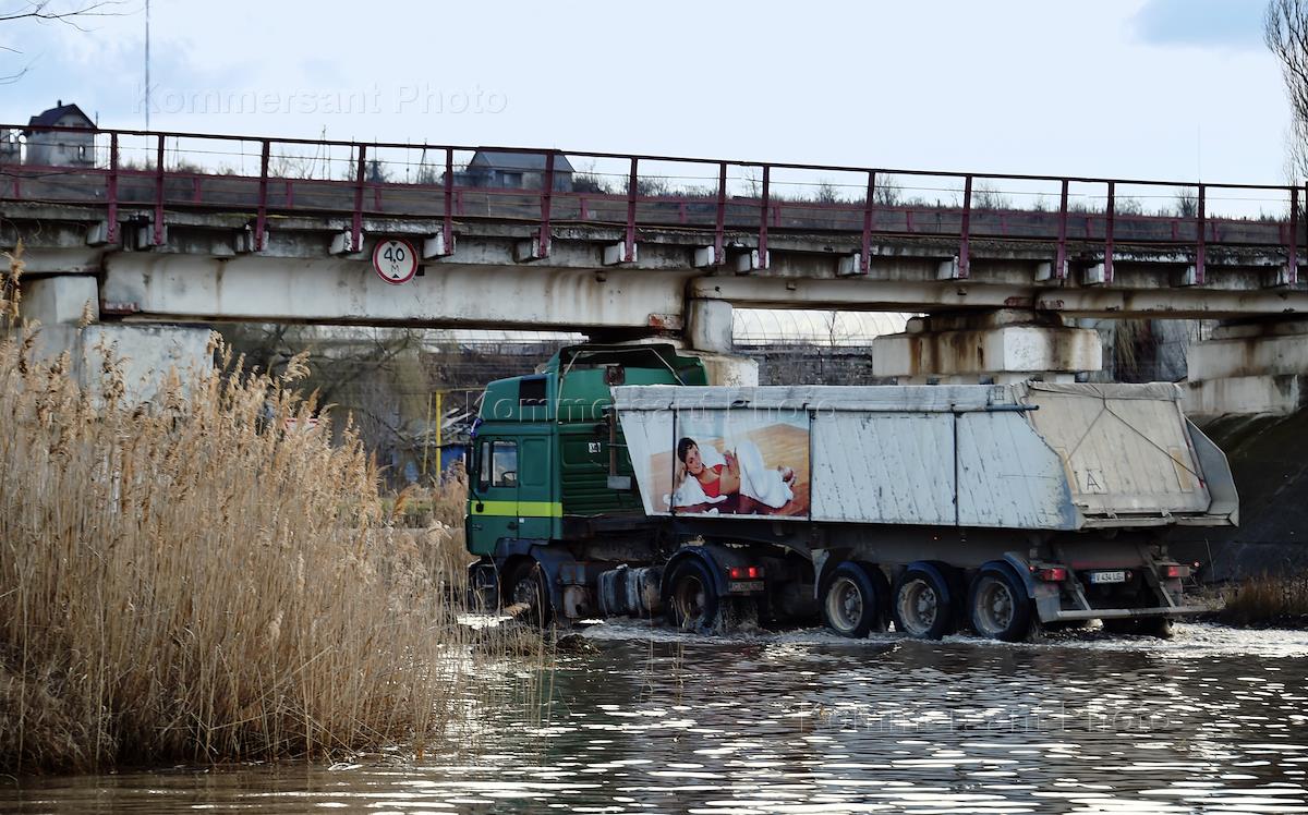 Жанровая фотография. Грузовик едет по затопленной дороге.