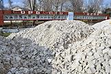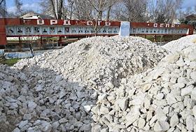 Жанровая фотография. Груды щебня и на фоне доски почета лучших труженников села.