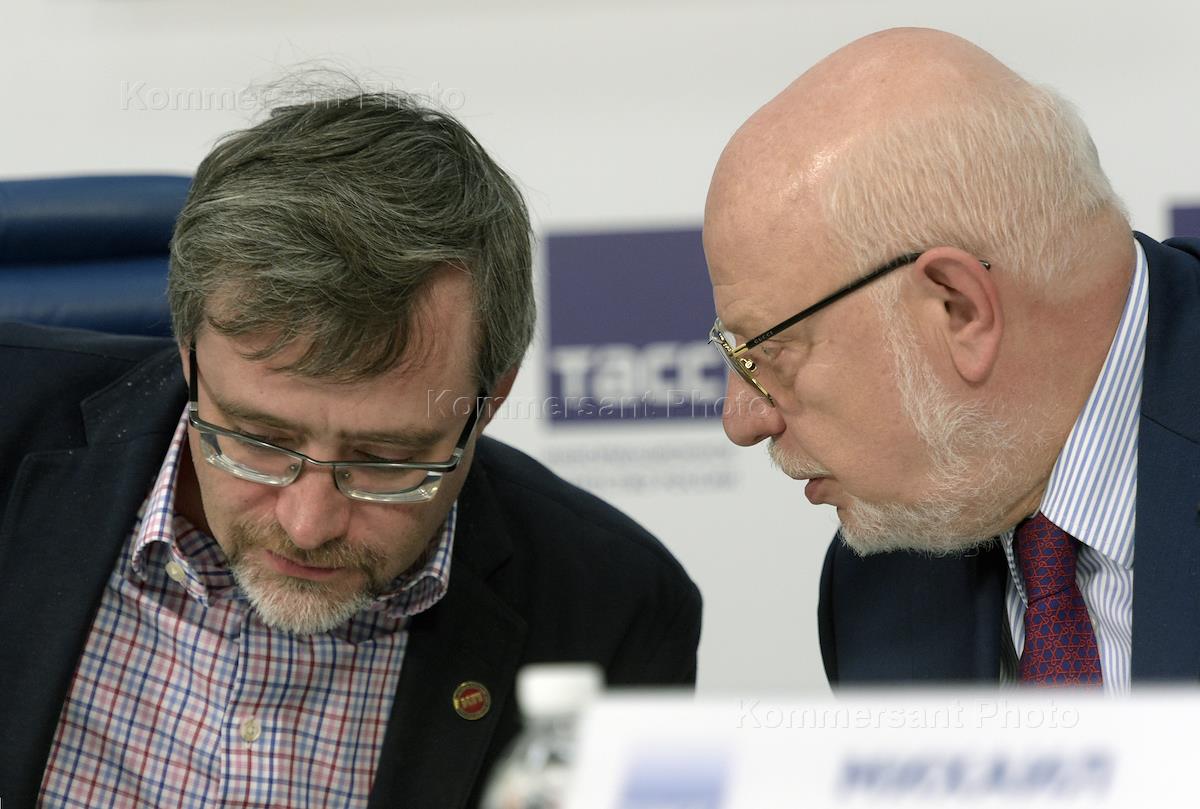 Пресс-конференция на тему "Исследование ВЦИОМ: история семьи и сталинские репрессии", посвященная презентации исследования по изучению семейной истории в контексте сталинских репрессий, в информационном агентстве ТАСС. Председатель Совета при президенте России по развитию гражданского общества и правам человека Михаил Федотов (справа) и генеральный директор ВЦИОМ Валерий Федоров (слева) во время пресс-конференции.