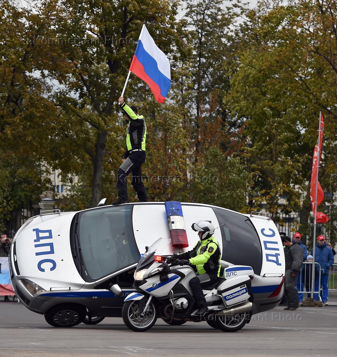 Спортивный праздник московской полиции, посвященный Дню сотрудника органов внутренних дел, в Олимпийском комплексе "Лужники". Участник пилотажной группы водительского мастерства Управления ГИБДД "Каскад" во время выступления на празднике.