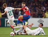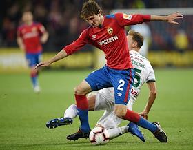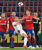 Российская Премьер-лига (РПЛ). Чемпионат России по футболу 2018/2019. 10-й тур. Матч между командами ЦСКА (Москва) и "Локомотив" (Москва) прошел на стадионе "ВЭБ Арена". Игроки команды ЦСКА Дмитрий Ефремов (слева), Иван Обляков (справа) и игрок команды "Локомотив" Гжегож Крыховяк (в центре) во время матча.