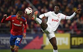 Российская Премьер-лига (РПЛ). Чемпионат России по футболу 2018/2019. 10-й тур. Матч между командами ЦСКА (Москва) и "Локомотив" (Москва) прошел на стадионе "ВЭБ Арена". Игрок команды ЦСКА Алан Дзагоев (справа) и вратарь команды "Локомотив" Маринато Гилерме (слева) во время матча.