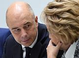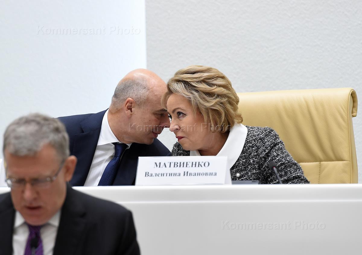 Парламентские слушания "О параметрах проекта федерального бюджета на 2019 год и на плановый период 2020 и 2021 годов" в Совете Федерации России. Первый заместитель председателя правительства России - министр финансов Антон Силуанов (слева) и председатель СФ России Валентина Матвиенко (справа) во время слушаний.