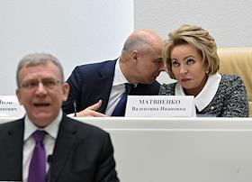 Парламентские слушания "О параметрах проекта федерального бюджета на 2019 год и на плановый период 2020 и 2021 годов" в Совете Федерации (СФ) России. Слева направо: первый заместитель председателя правительства России - министр финансов Антон Силуанов, председатель СФ России Валентина Матвиенко и председатель Счетной палаты России Алексей Кудрин во время слушаний.