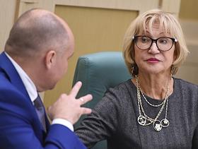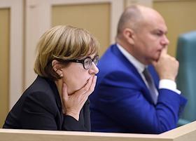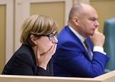 Парламентские слушания "О параметрах проекта федерального бюджета на 2019 год и на плановый период 2020 и 2021 годов" в Совете Федерации (СФ) России. Представитель в СФ России от исполнительного органа государственной власти Курганской области Елена Перминова (справа) и представитель в СФ России от законодательного (представительного) органа государственной власти Тверской области Владимир Петров (слева) перед началом слушаний.