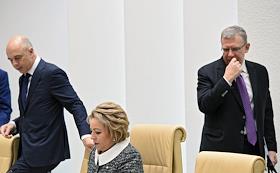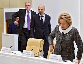 Парламентские слушания "О параметрах проекта федерального бюджета на 2019 год и на плановый период 2020 и 2021 годов" в Совете Федерации России. Слева направо: первый заместитель председателя правительства России - министр финансов Антон Силуанов, председатель Счетной палаты России Алексей Кудрин и председатель СФ России Валентина Матвиенко во время слушаний.