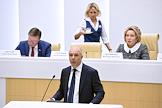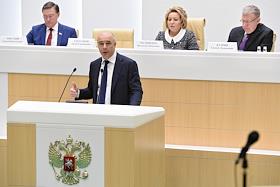 Парламентские слушания "О параметрах проекта федерального бюджета на 2019 год и на плановый период 2020 и 2021 годов" в Совете Федерации России. Первый заместитель председателя правительства России - министр финансов Антон Силуанов во время слушаний.