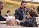 Парламентские слушания "О параметрах проекта федерального бюджета на 2019 год и на плановый период 2020 и 2021 годов" в Совете Федерации России. Губернатор Самарской области Дмитрий Азаров (справа) и губернатор Мурманской области Марина Ковтун (в центре) во время слушаний.