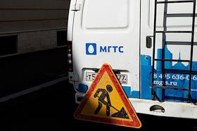 Жанровая фотография. Автомобиль компании МГТС и знак "дорожные работы" на Харитоньевском переулке.