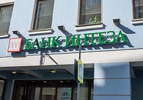 Жанровая фотография. Вывеска и логотип "Банк Интеза" над входом в отделение банка.