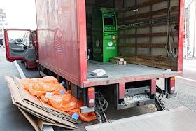 Жанровая фотография. Неисправный банкомат "Сбербанка" в кузове грузовой машины.