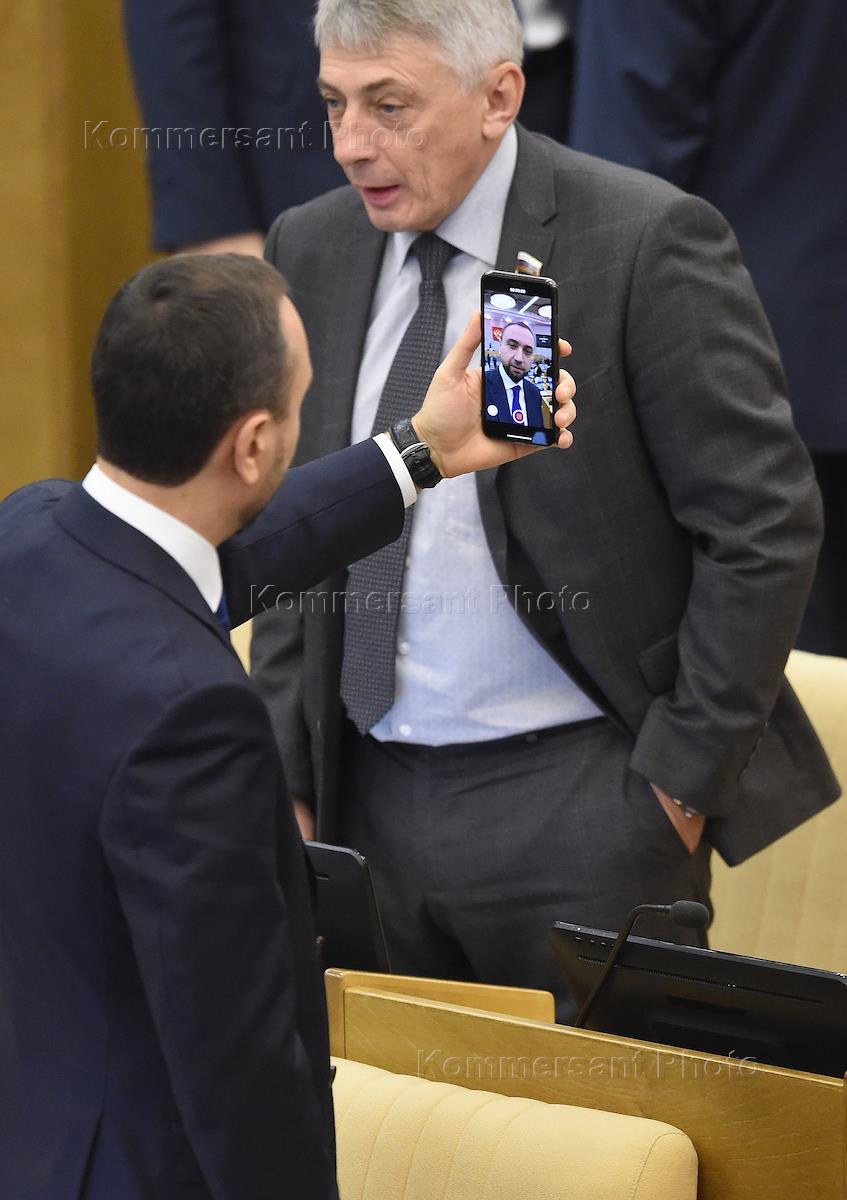 Пленарное заседание Государственной думы (ГД) России. Член комиссии ГД России по вопросам депутатской этики Шамсаил Саралиев (слева) и член комитета ГД России по труду, социальной политике и делам ветеранов Владимир Мельник (справа) перед началом заседания.