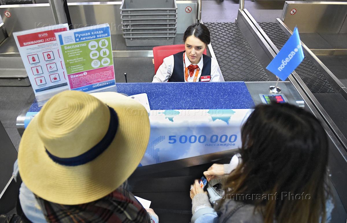 Мероприятие, посвященное 5 млн. пассажиру авиакомпании "Победа", прошло в аэропорту "Внуково". Сотрудница авиакомпании "Победа" у регистрационной стойки.