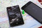 Жанровая фотография. Смартфоны с разбитыми экранами на карте иностранного государства.