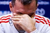 Пресс-конференция главного тренера сборной России по футболу Станислава Черчесова и футболиста Артема Дзюбы перед игрой сборной России со сборной Швеции. Капитан сборной России Артем Дзюба во время пресс-конференции.