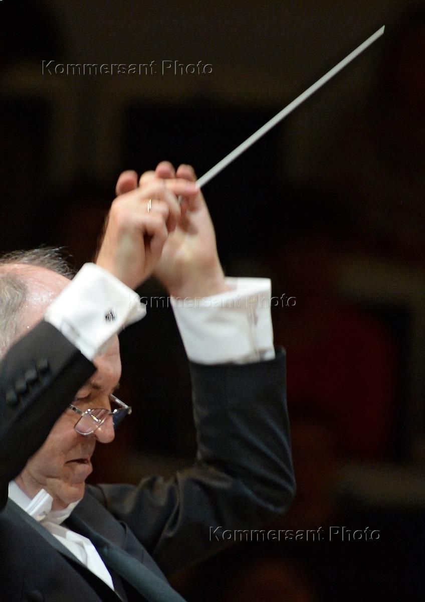 Концерт Эдуарда Артемьева "Девять шагов к Преображению" к 90-летию основателя и художественного руководителя Московского камерного хора Владимира Минина прошел в Концертном зале имени П.И.Чайковского. Дирижер Сергей Скрипка во время исполнения концерта.