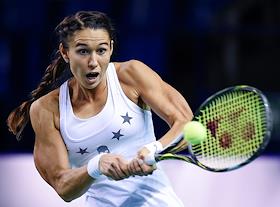 XXIX Международный теннисный турнир "ВТБ Кубок Кремля" прошел в спорткомплексе "Олимпийский". Женщины. Одиночный разряд. 1-й круг. Хорватская теннисистка Айла Томлянович во время матча против российской теннисистки Анастасии Павлюченковой.