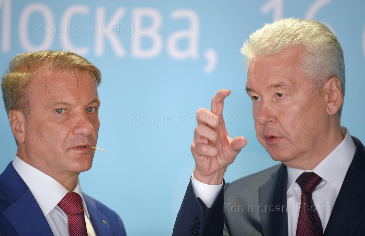 Президент, председатель правления Сбербанка России Герман Греф (слева) и мэр Москвы Сергей Собянин (справа) перед началом заседания Попечительского Совета Фонда "Сколково".