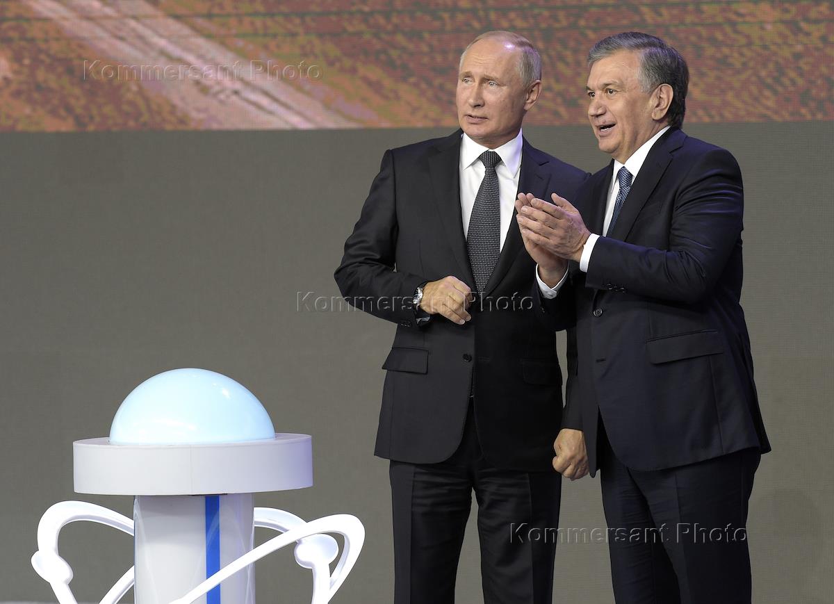 Рабочая поездка президента России Владимира Путина в Ташкент. Президент России Владимир Путин (слева) и президент Узбекистана Шавкат Мирзиеев (справа) во время церемонии старта реализации проекта строительства АЭС в районе озера Тудакуль в рамках Форума межрегионального сотрудничества России и Узбекистана.
