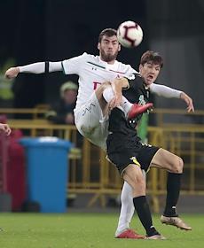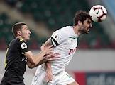 Российская Премьер-лига (РПЛ). Чемпионат России по футболу 2018/2019. 11-й тур. Матч между командами "Локомотив" (Москва) и "Ростов" (Ростов-на-Дону) на стадионе "РЖД Арена". Игрок команды "Локомотив" Антон Миранчук (справа) и игрок команды "Ростов" Аяз Гулиев (в центре) во время матча.