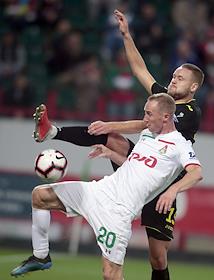 Российская Премьер-лига (РПЛ). Чемпионат России по футболу 2018/2019. 11-й тур. Матч между командами "Локомотив" (Москва) и "Ростов" (Ростов-на-Дону) на стадионе "РЖД Арена". Игрок команды "Ростов" Сверрир Ингасон (справа) и игрок команды "Локомотив" Владислав Игнатьев (слева) во время матча.