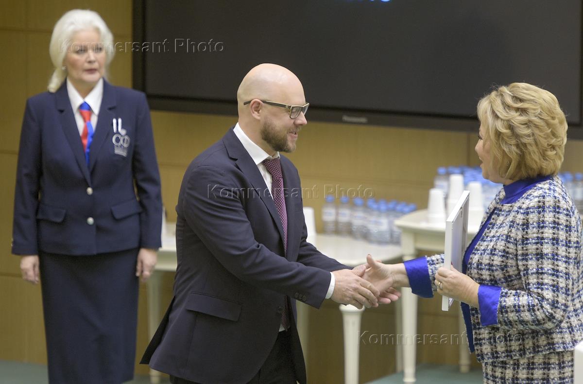Пленарное заседание Совета Федерации (СФ) России. Председатель СФ России Валентина Матвиенко (справа) и бывший представитель в СФ России от исполнительного органа государственной власти Владимирской области Антон Беляков (в центре) во время заседания.