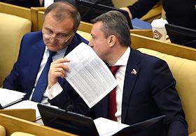 Пленарное заседание Государственной думы (ГД) России. Член комитета ГД России по экологии и охране окружающей среды Александр Фокин (слева) и заместитель председателя комитета ГД России по безопасности и противодействию коррупции Анатолий Выборный (справа) во время заседания.