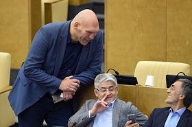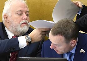 Пленарное заседание Государственной думы (ГД) России. Член комитета ГД России по транспорту и строительству Евгений Серпер (слева) и председатель комитета ГД России по физической культуре, спорту, туризму и делам молодежи Михаил Дегтярев (справа) во время заседания.