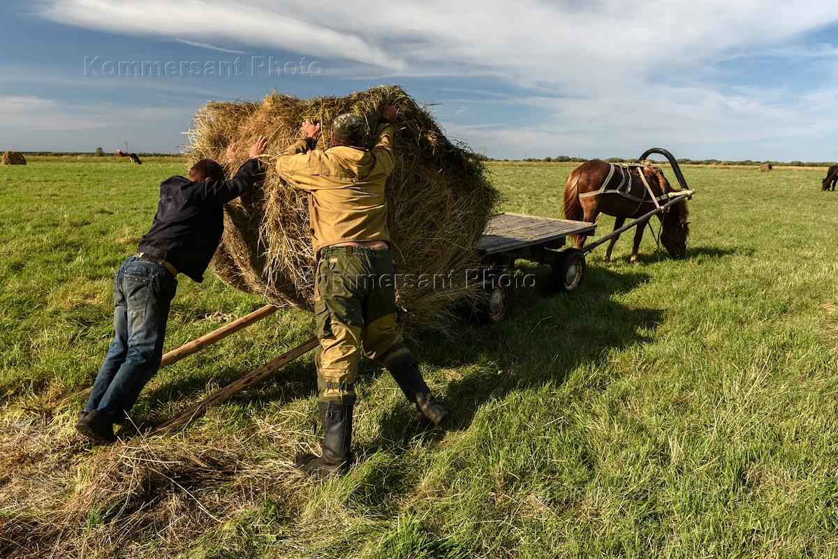 Муж конезаводчицы Елены Поршневой Андрей Григорьев с помошником работает в поле. Уборка сена. Погрузка снопа на телегу.