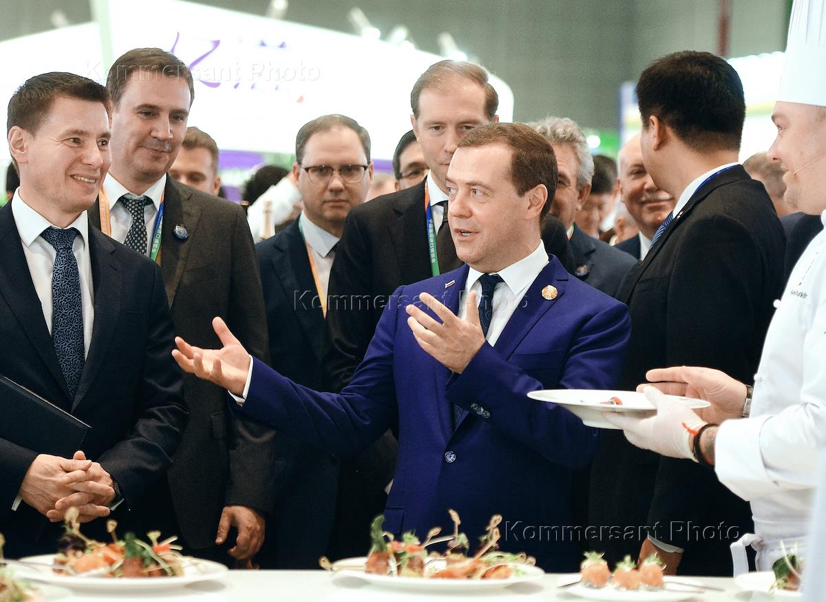 Рабочая поездка председателя правительства России Дмитрия Медведева в Шанхай. Председатель правительства России Дмитрий Медведев (справа), генеральный директор АО "Российский экспортный центр" Андрей Слепнев (слева) и министр сельского хозяйства России Дмитрий Патрушев (второй слева) во время посещения Первой китайской международной импортной выставки "Импорт Экспо" Canton Fair CIIE 2018 в Шанхае.