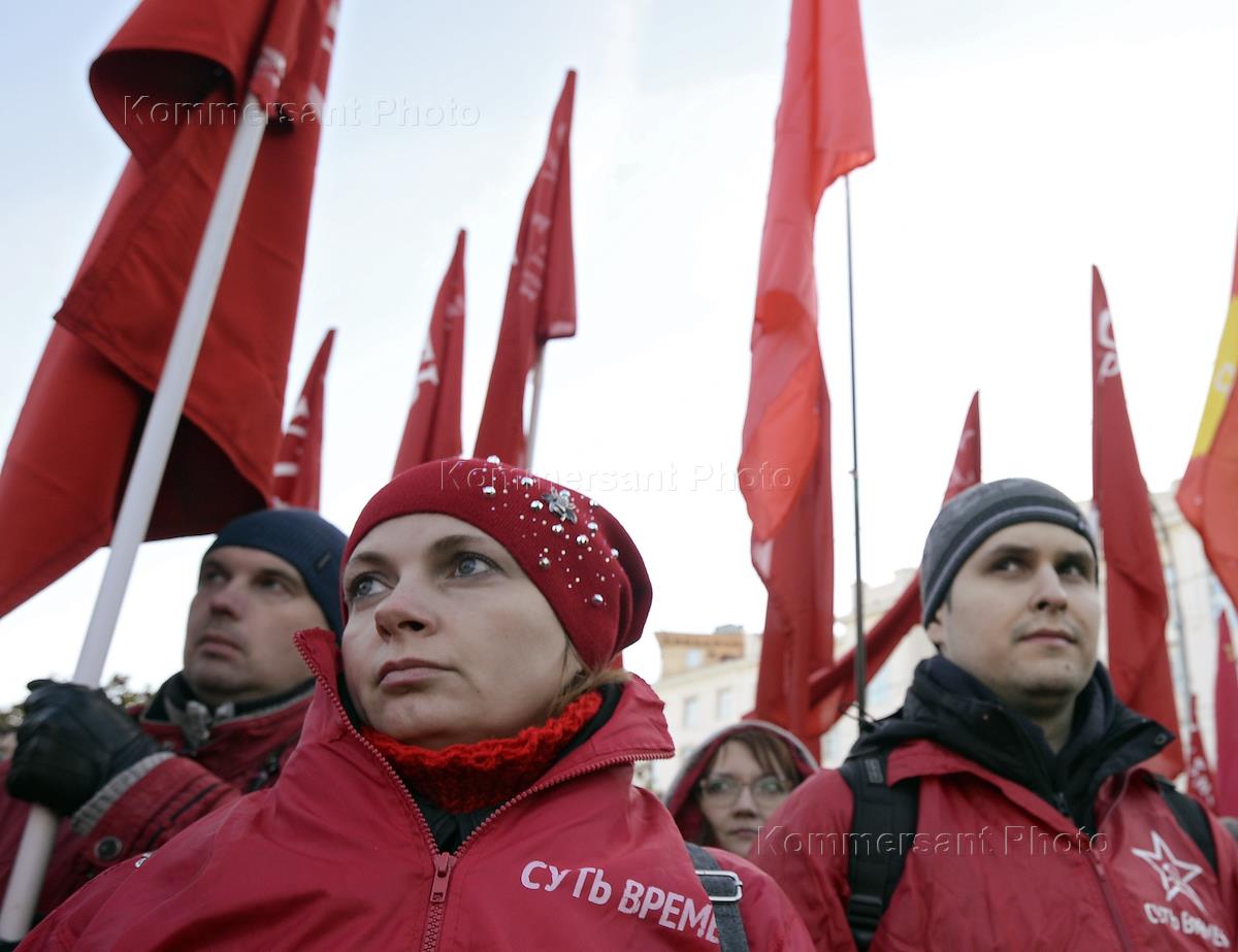 Участники митинга в честь 101-й годовщины Великой Октябрьской социалистической революции и против повышения пенсионного возраста, организованного движением "Суть времени".
