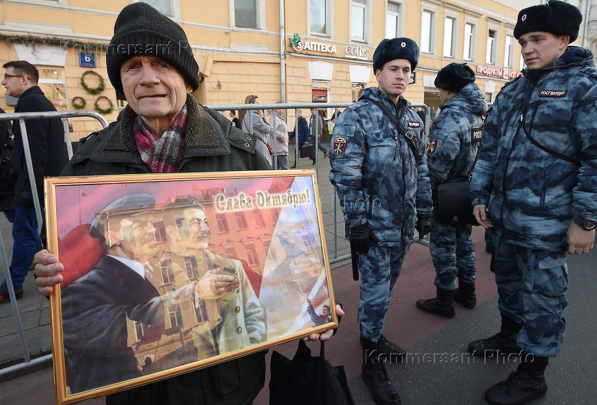 Шествие сторонников Коммунистической партии России (КПРФ), посвященное 101-й годовщине Октябрьской революции, от Страстного бульвара до Площади Революции.