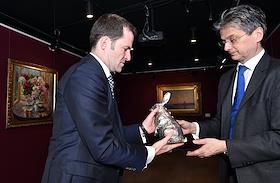 Пресс-показ, посвященный открытию выставки "Шедевры Русского Искусства" аукционного дома CHRISTIE’S. Международный директор департамента русского искусства Christie’s Алексей Тизенгаузен (справа) на пресс-показе.
